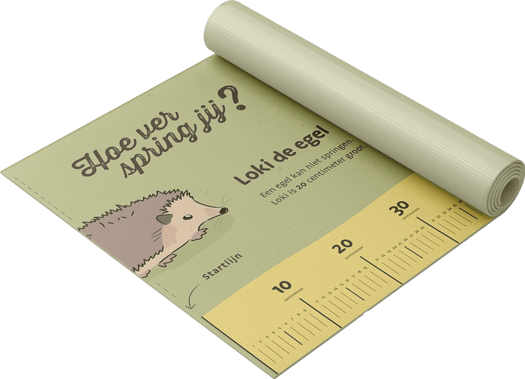 Er staan vier dieren op het springdoek: een egel, een kikker, een eekhoorn en een haas. Ieder dier staat bij de afstand die ze kunnen springen en nodigt uit om te springen en vergelijken.